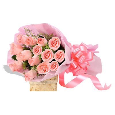 • Arrangement of Premium 15 Pink Roses with Seasonal foliage.