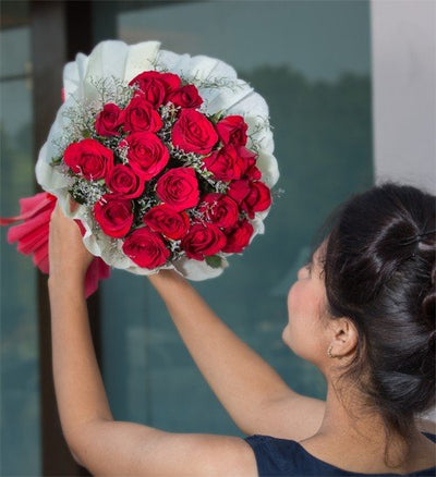 This striking arrangement of red roses enrobed with leaves is astonishing in its simplicity. A red rose is a flower that needs little prettification, a specialty Arena bouquet, lets this mark of harmony and pristine grace speak for itself. A festive arrangement, lovely as a wedding or anniversary gift, is perfect with its promise of timelessness.