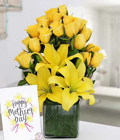 Vase arrangement of 22 Yellow Flowers (Roses & Lilies).