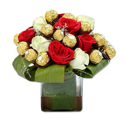 • Chocolate Bouquet of 5 Red and 5 White Roses arranged with 16 Pc Ferrero Rocher.
