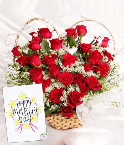 Basket arrangement of 24 Red Roses with Mothers Day Greeting Card.